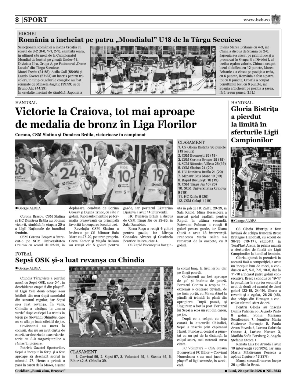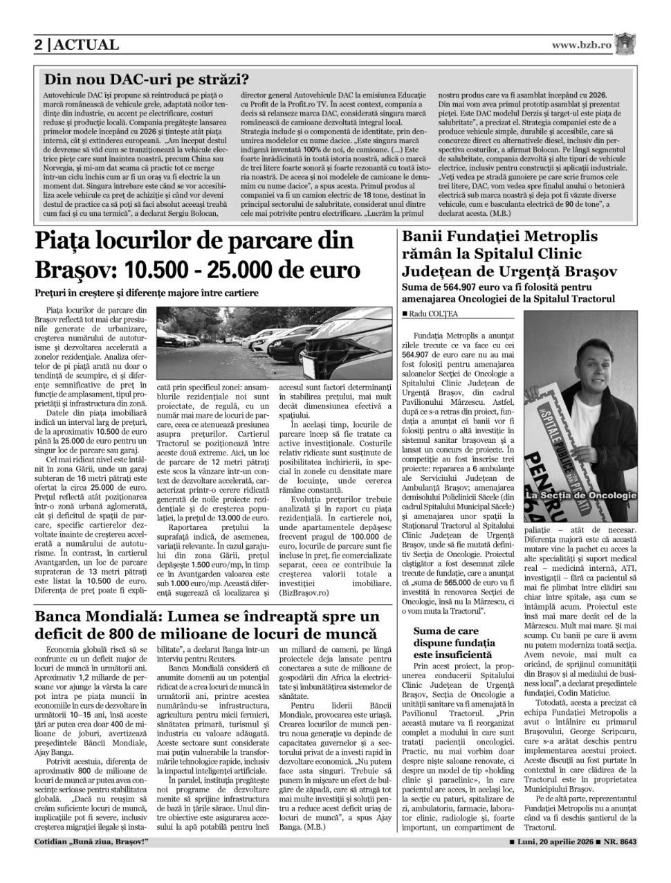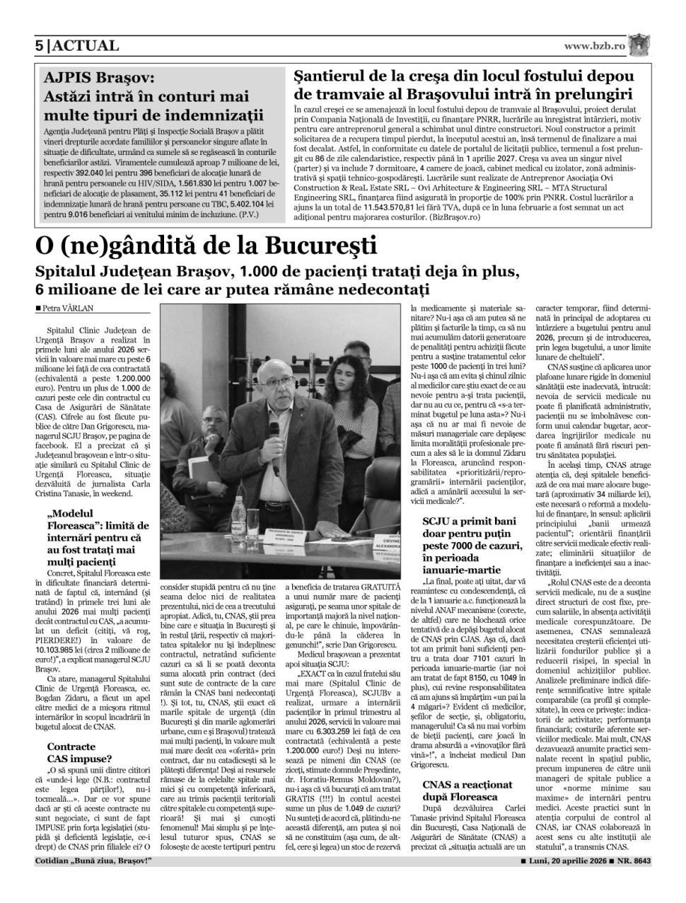 Spitalul Clinic Judeţean de Urgenţă Braşov a realizat în primele luni ale anului 2026 servicii în valoare mai mare cu peste 6 milioane lei faţă de cea contractată (echivalentă a peste[...] » citeste mai mult
