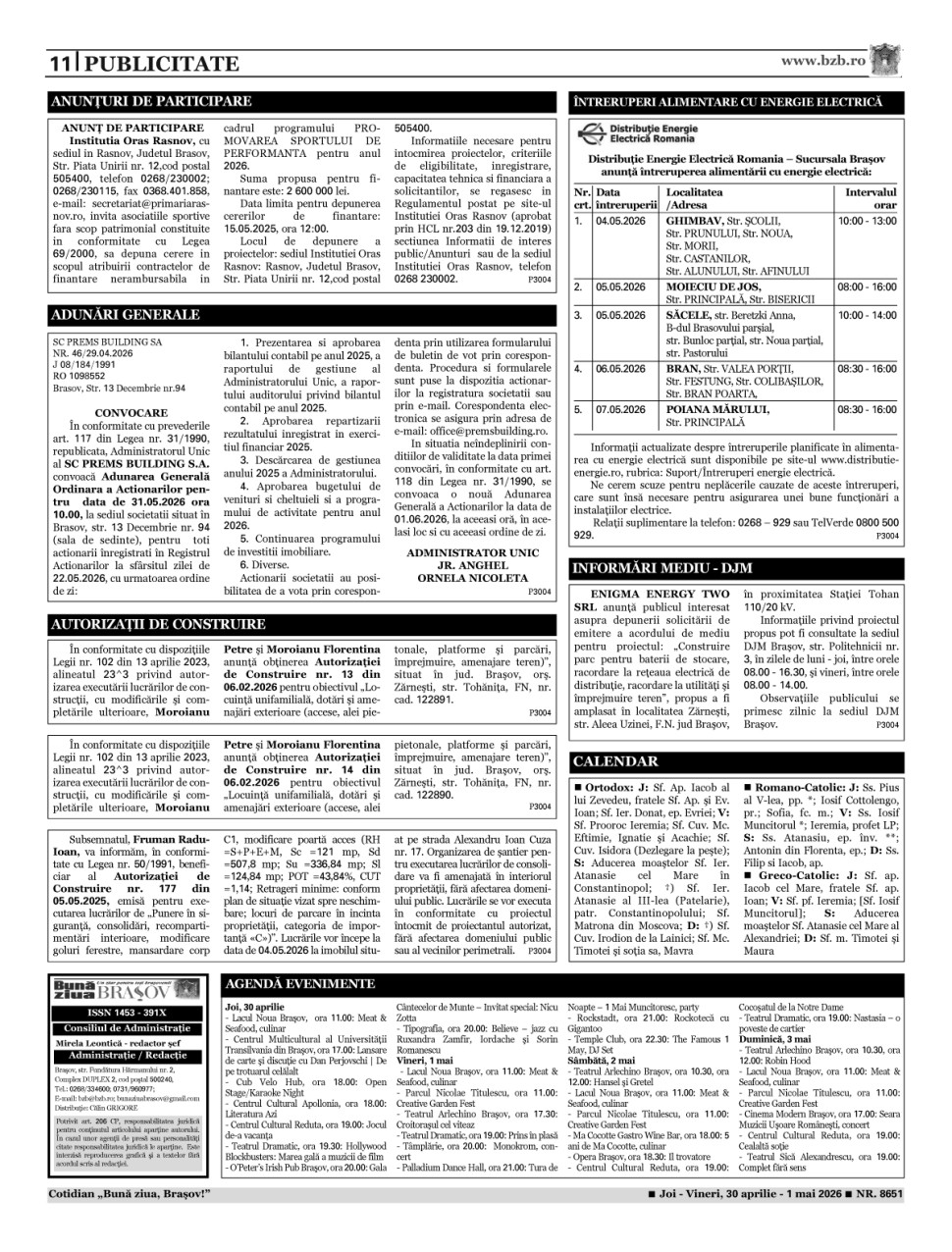 MUNICIPIUL BRAŞOV: Agenda de evenimente