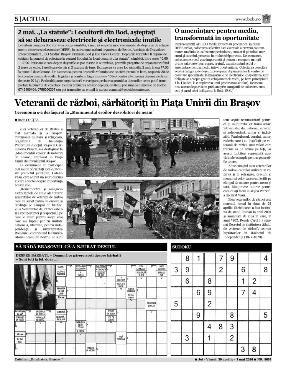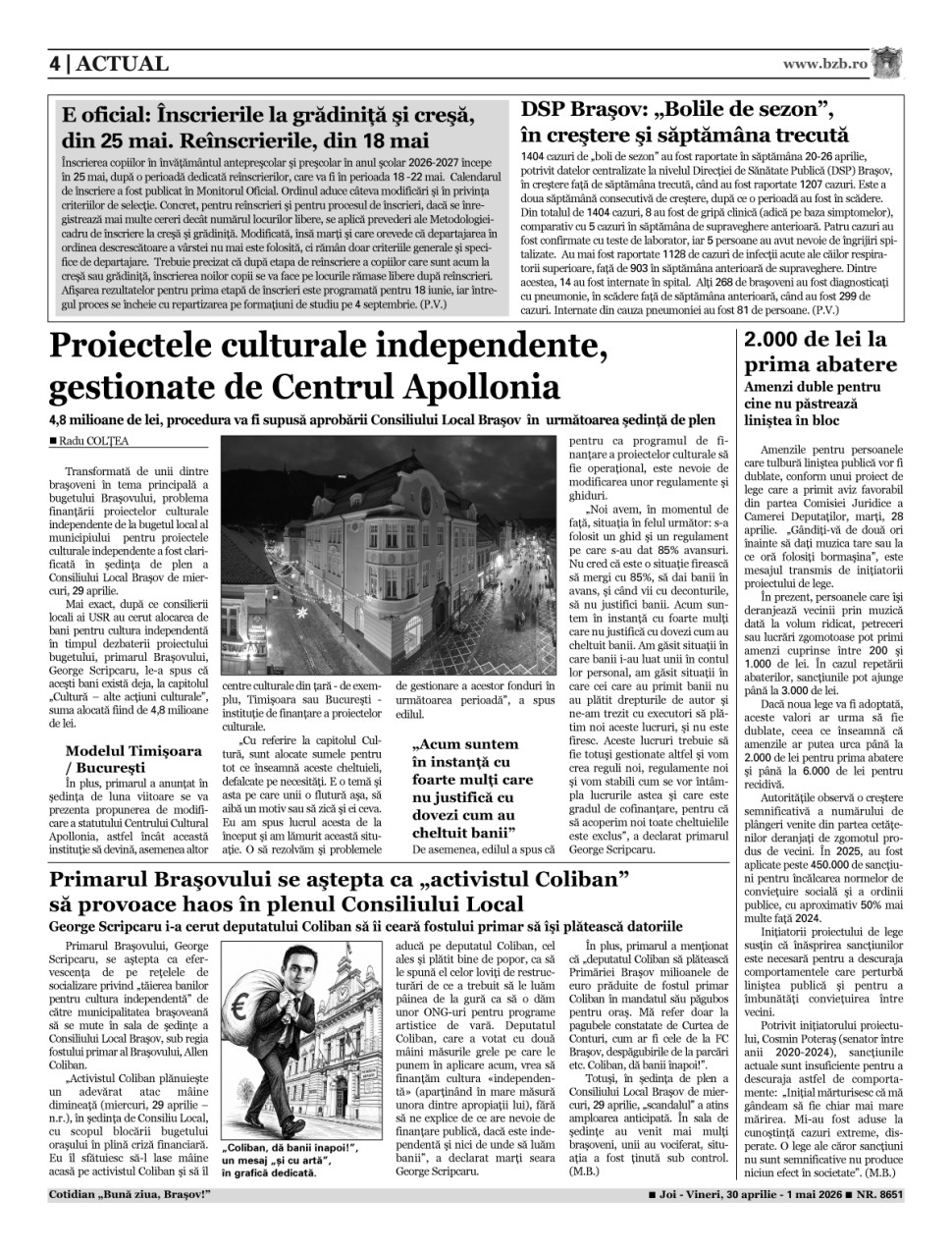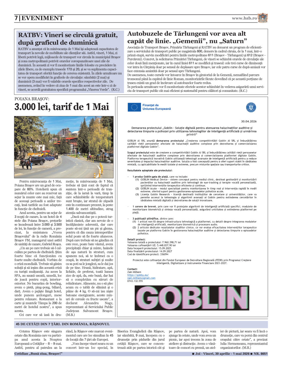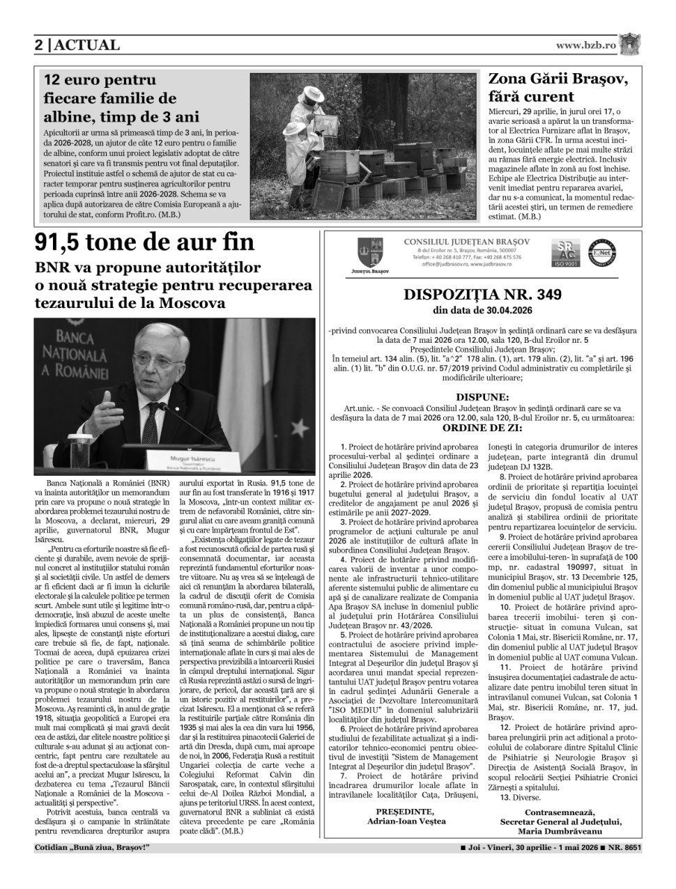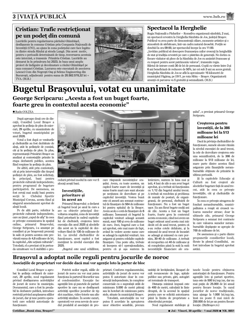 După aproape două ore de discuţii, Consiliul Local Braşov a aprobat în şedinţa de plen de miercuri, 29 aprilie, cu unanimitate de voturi, bugetul municipiului pe anul 2026.  Votul a[...] » citeste mai mult