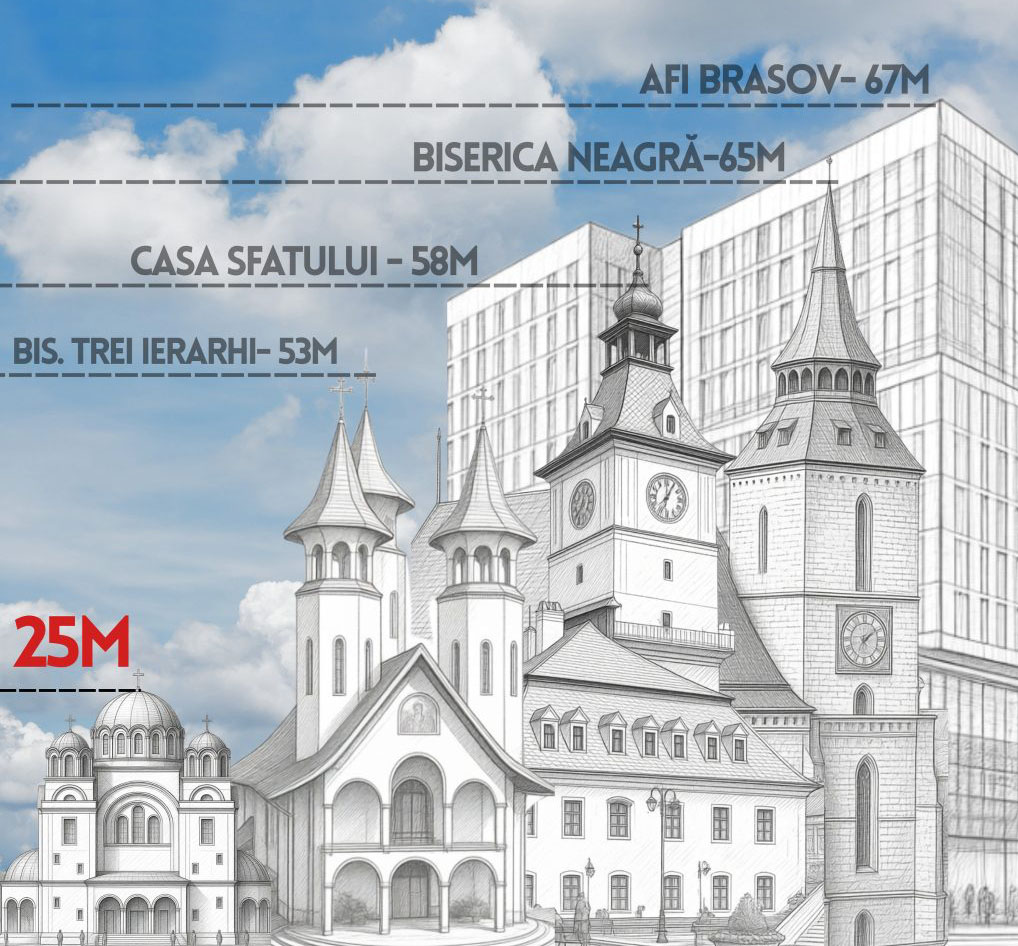 Reprezentanţii asociaţiei au postat şi o ilustraţie în care sunt comparate mărimile unor edificii importante din municipiu în raport cu cele ale viitoarei catedrale. „Dumnezeu preferă adevărul! Am ales să aducem la cunoştinţă adevărul, tuturor locuitorilor urbei. Ideea de «mastodont» este străină celor ce au întocmit planul acestui monument-simbol. Astfel, 25 m este înălţimea care nu impune prin dimensiune, ci prin rolul spiritual pe care îl aduce credincioşilor braşoveni (şi nu numai)Vă invităm să analizaţi înălţimea altor clădiri emblematice din Braşov, cu care Catedrala ar putea fi comparată, aceasta având, de fapt, dimensiuni considerabil mai reduse. Prin urmare, se confirmă că echilibrul urban al Centrului Civic nu va fi afectat, ci, dimpotrivă, armonios completat de noul lăcaş de cult”, au subliniat reprezentanţii asociaţiei.