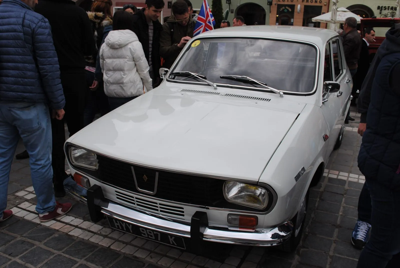 Foto: Renault 12 TS, cu volan pe dreapta. Un frate al Daciei 1300 vine tocmai din Marea Britanie, pe platformă, pentru evenimentul de la Braşov. Proprietar este celebrul violonist român Remus Azoiţei, stabilit la Londra. Maşina a fost declarată „cel mai frumos Renault 12 din Marea Britanie”.
