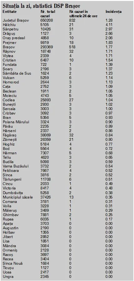 175 de noi cazuri de infectare cu Covid au fost raportate, în judeţ, în ultimele 24 de ore, au anunţat autorităţile marţI, 21 septembrie. Astfel, bilanţul judeţean al îmbolnăvirilor a ajuns la 45.234 de cazuri. Incidenţa cumulată a cazurilor confirmate de COVID-19 la 1000 de locuitori pentru ultimele 14 zile în judeţul Braşov, calculată de Direcţia de Sănătate Publică, este de 1,28. A municipiului Braşov, de 1,77 la mie.