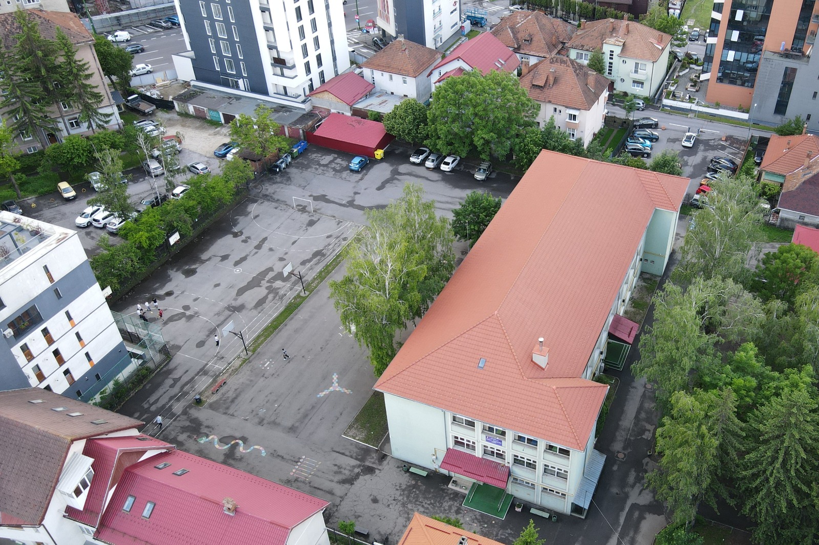 Spaţiile exterioare se vor amenaja cu alei pietonale, parcare, spaţii verzi şi teren de sport, rampe pentru persoane cu dizabilităţii la intrările principale, mobilier urban adecvat în spaţiile verzi şi pe lângă terenul de sport.