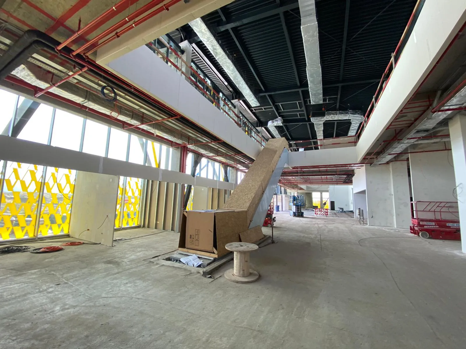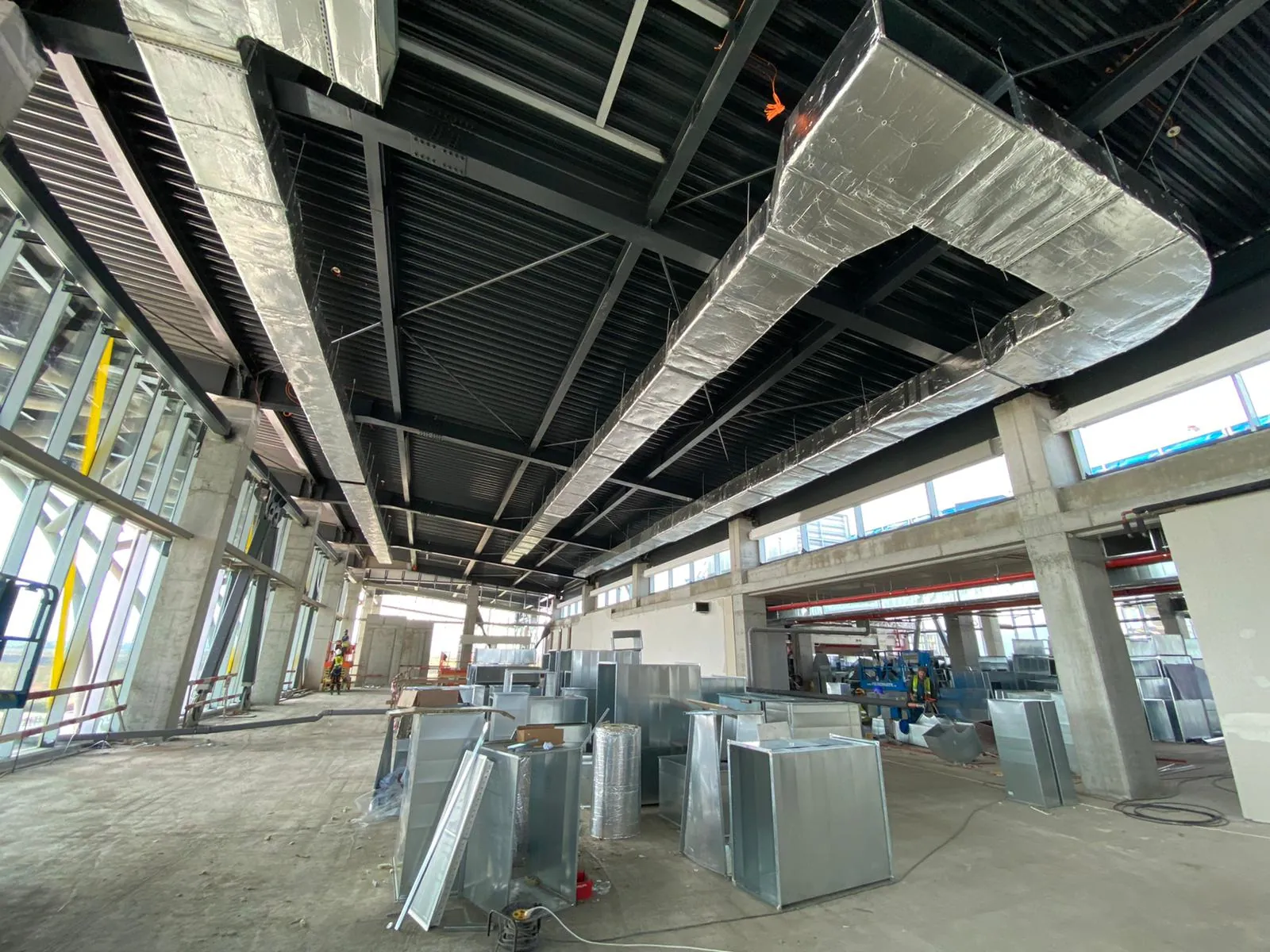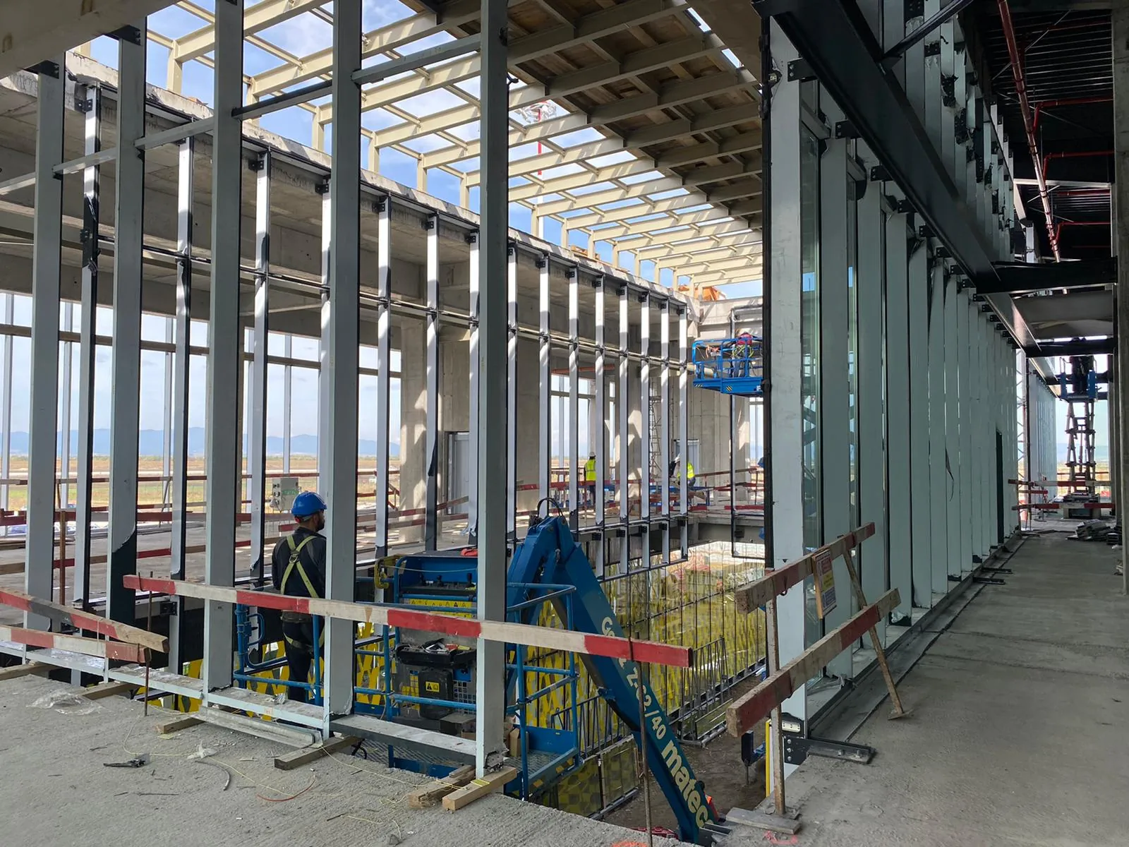 La etajul întâi, unde vor exista trei porţi de îmbarcare pentru zborurile internaţionale, pereţii au fost în mare parte acoperiţi cu sticlă, iar spaţiul destinat viitorului restaurant a fost delimitat.