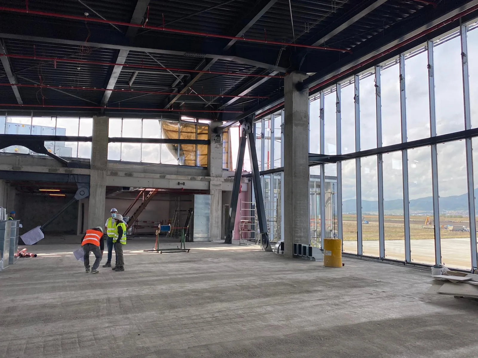 Tot la primul etaj al terminalului au fost delimitate spaţiile în care vor fi amenajate birourile de securitate şi control vamal, cele destinate magazinelor duty-free şi cele aferente porţilor de îmbarcare, fiind demarate şi lucrările la instalaţii.