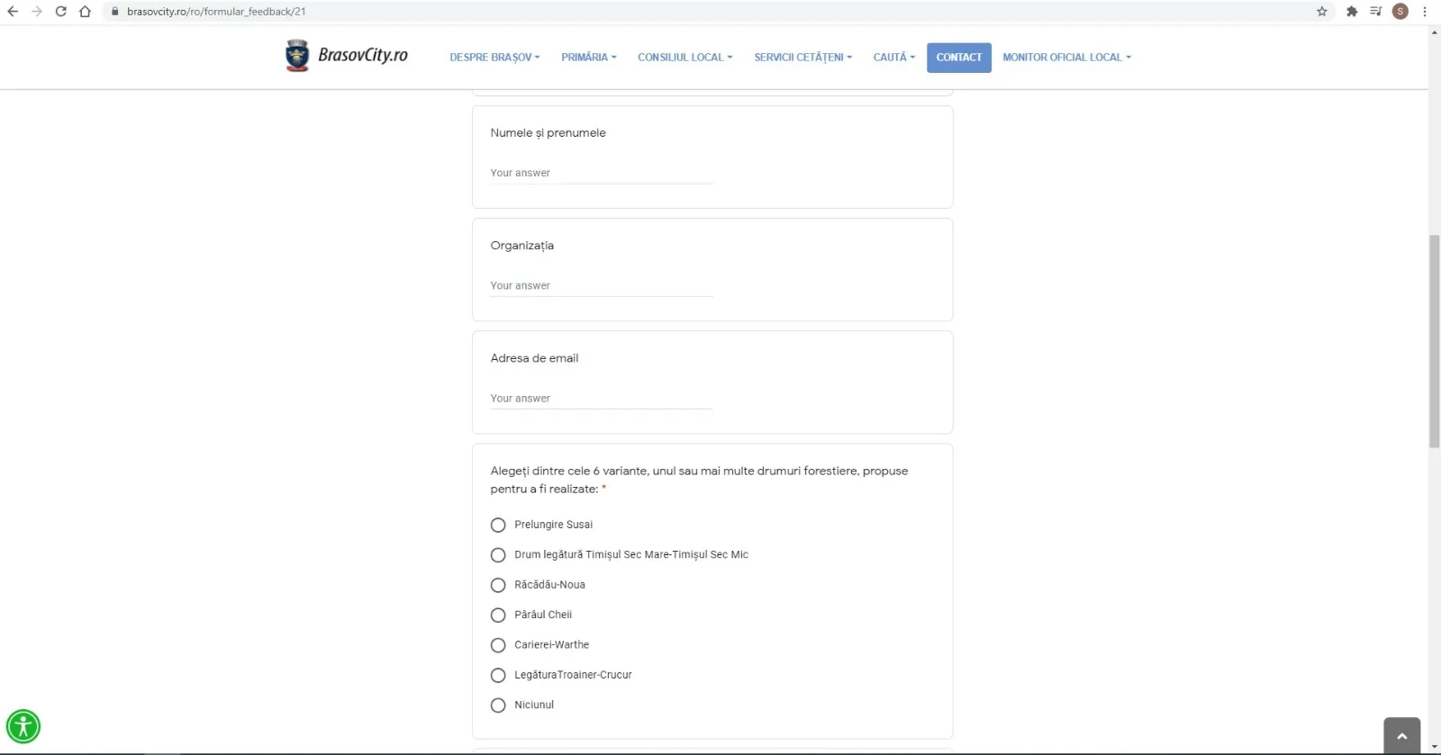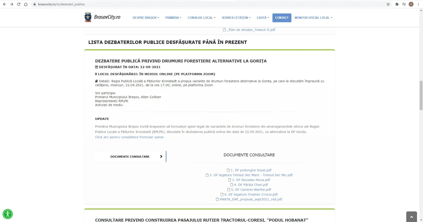 După ce la dezbaterea online pe platforma Zoom, organizată de Primăria Braşov privind drumuri forestiere alternative la „Goriţa” s-au uitat puţin peste 40 de braşoveni şi au vorbit cel mult 10, municipalitatea braşoveană a decis să organizeze o a doua etapă a consultării publice, tot online. De data aceasta, este vorba de un formular ce poate fi completat pe site-ul Primăriei Braşov, care conţine o întrebare închisă (în care sunt prezentate variantele) şi una deschisă. Mai exact, oamenii sunt invitaţi să răspundă întrebării: „Alegeţi dintre cele şase variante, unul sau mai multe drumuri forestiere, propuse pentru a fi realizate”. Pe listă sunt drumurile „Prelungire Susai”, „Drum legătură Timişul Sec Mare-Timişul Sec Mic”, „Răcădău-Noua”, „Pârâul Cheii”, „Carierei-Warthe”, „Legătura Troainer-Crucur”, iar răspunsul poate fi multiplu (se poate alege una sau mai multe variante). La aceeaşi întrebare este şi opţiunea „Niciunul”.
