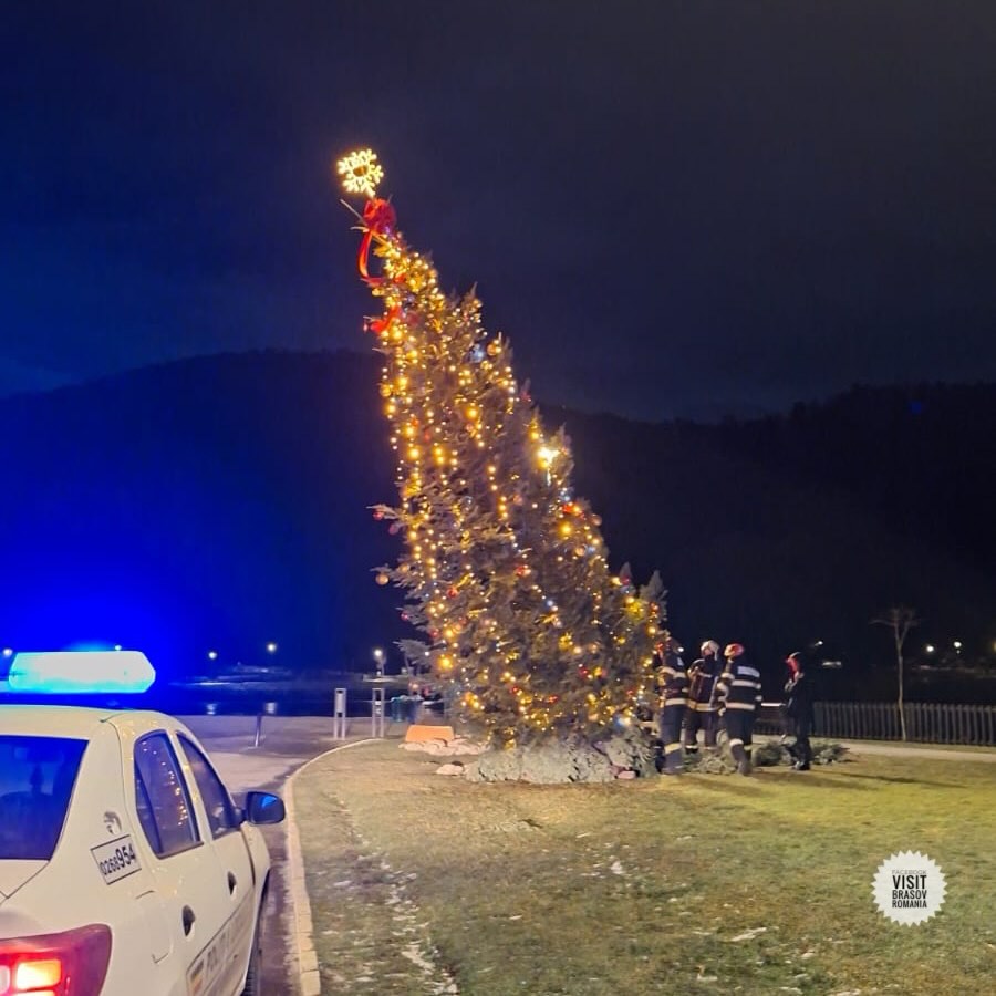 Luminiţele bradului de Crăciun din parcul de la Lacul Noua au fost „stinse” înainte de vreme. Mai exact, vântul puternic din noaptea 2/3 ianuarie 2026 a înclinat bradul, iar echipele de intervenţie au stabilit că, pentru a nu pune în pericol siguranţa cetăţenilor, acesta trebuie demontat.