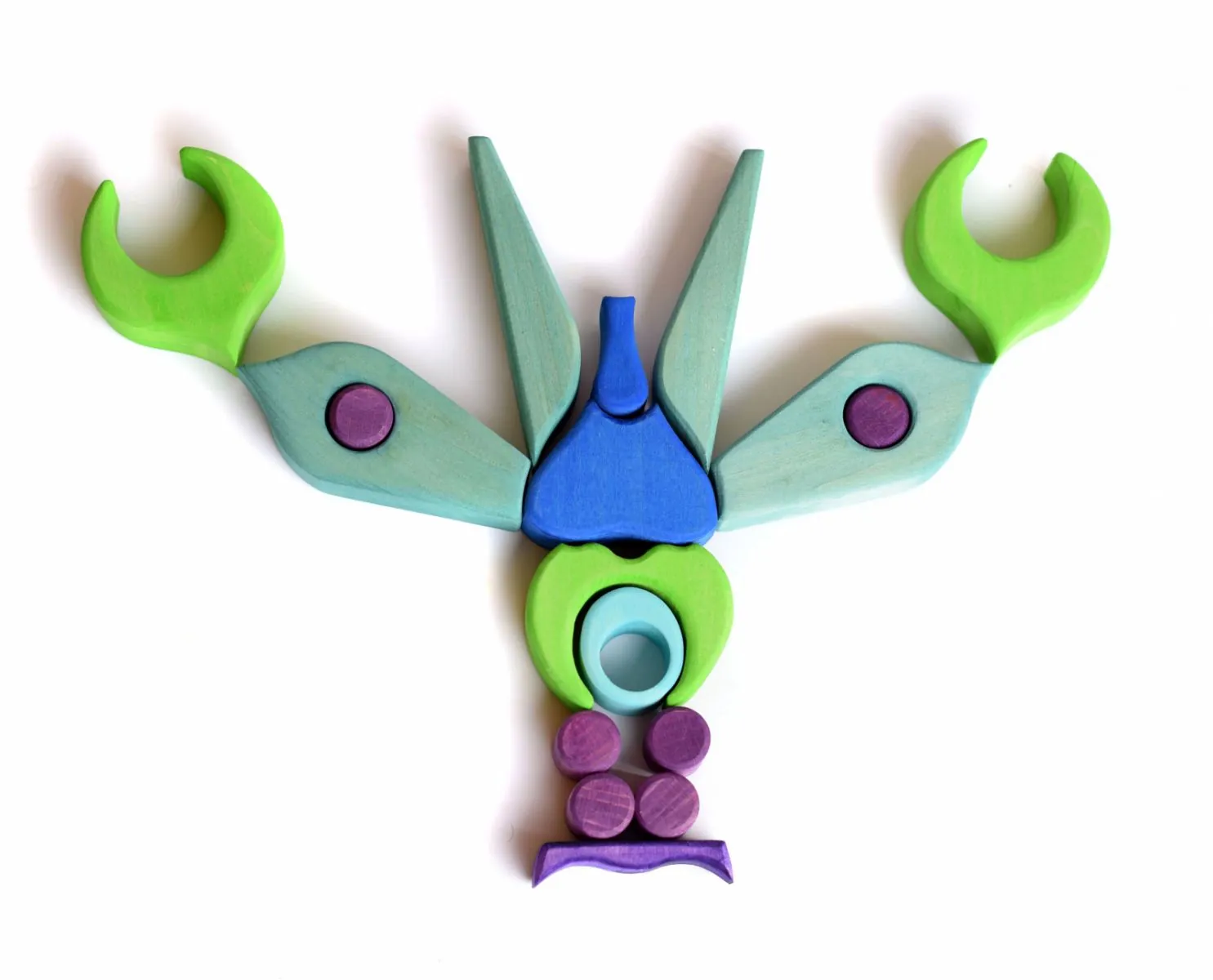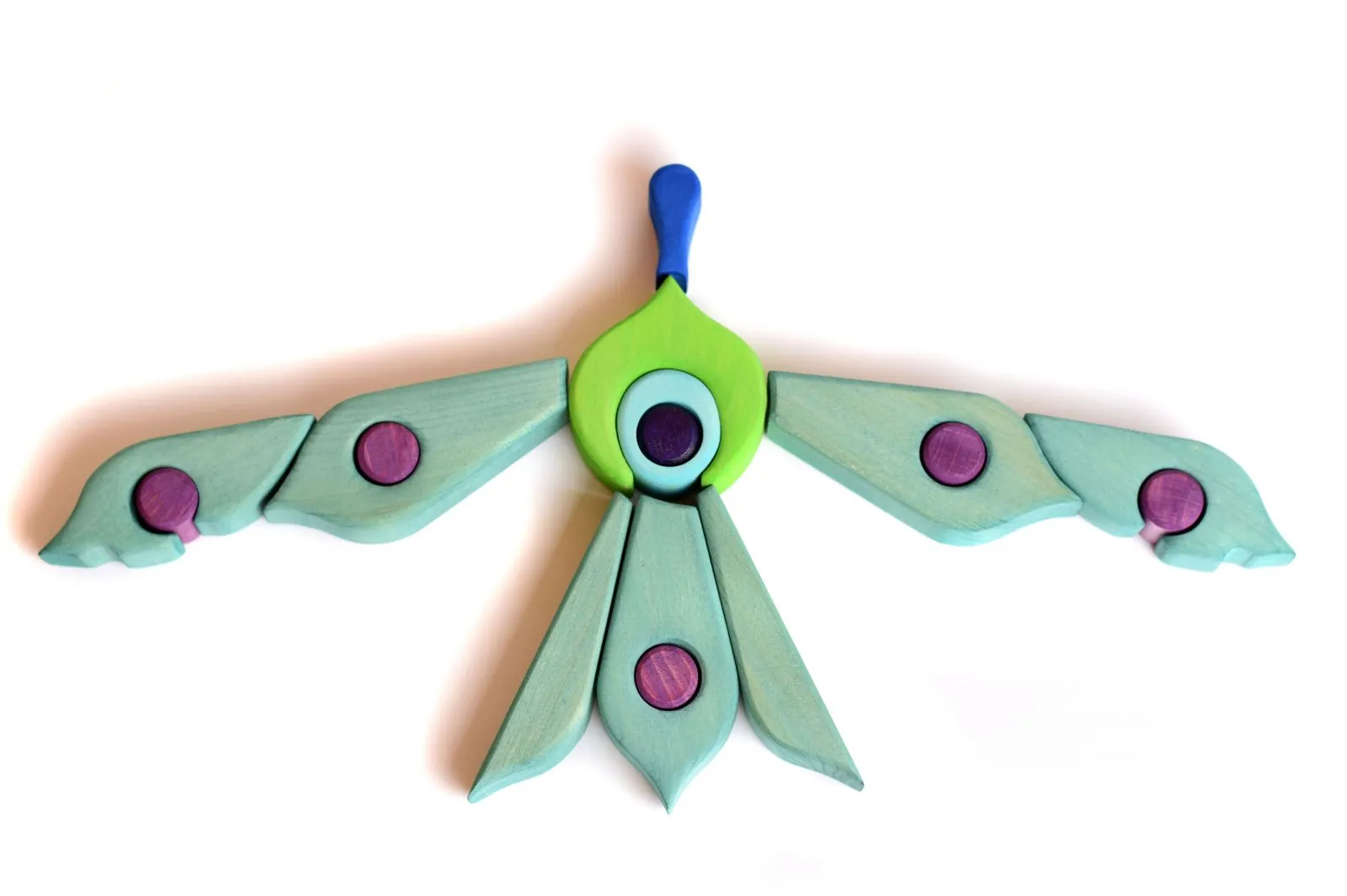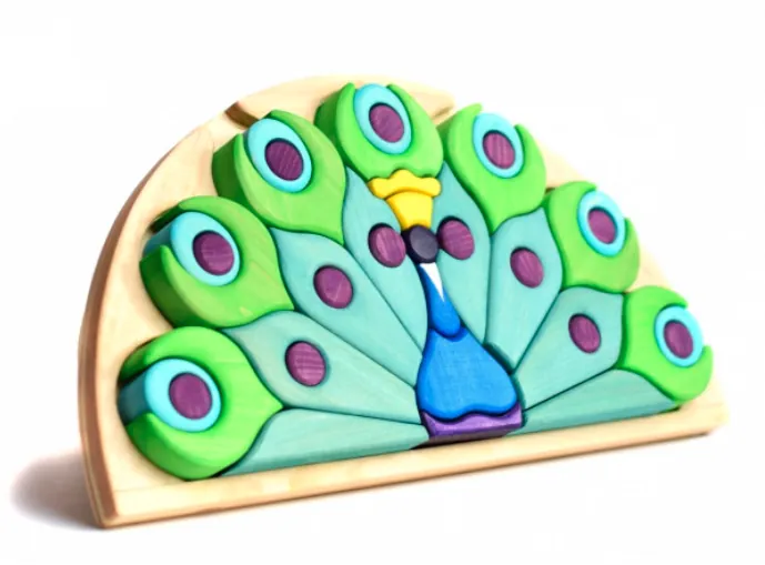Puzzle-ul Păun este realizat în forma minunatului păun cu penajul său extravagant. Din piesele jucăriei copilul poate construi diferite forme interesante - case mici, turnuleţe şi chiar diferite animale favorizand dezvoltarea imaginaţiei şi creativităţii copilului. Acest puzzle poate fi utilizat pentru a ajuta copiii să repete culorile, să îşi dezvolte motricitatea fină, echilibrul şi pot învăţa să numere. Puzzle-ul Păun este livrat într-un cadru semirotund din lemn, repetând forma penajului, astfel încât copilul să poată asambla cu uşurinţă puzzle-ul şi să-l depoziteze frumos în acest cadru.