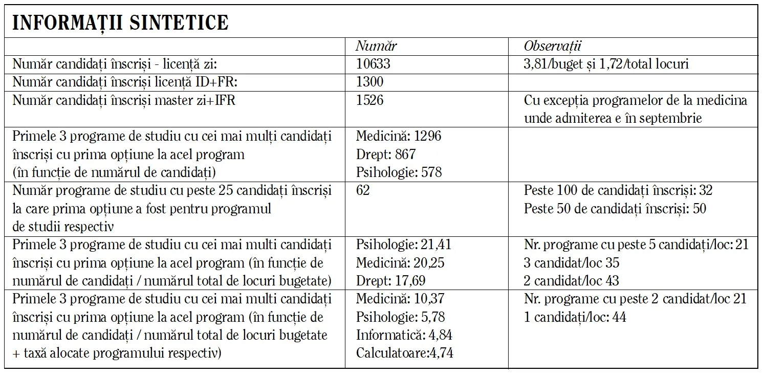 Din cele peste 10.000 de înscrieri, 1713 sunt doar pentru Facultatea de Medicină, unde se intră cu examen şi unde locurile sunt 149 bugetate şi 178 cu taxă. La toate cele 4 programe de studiu: Medicină, Asistenţă medicală generală, Balneofiziokinetoterapie şi recuperare şi Laborator clinic. La toate, candidaţii susţin examen, iar nota de la Bac contează într-o măsură mai mare sau mai mică. Potrivit reprezentanţilor Universităţii, concurenţa pentru programul de Medicină (cel mai căutat) este de 20 de candidaţi pe loc bugetat.