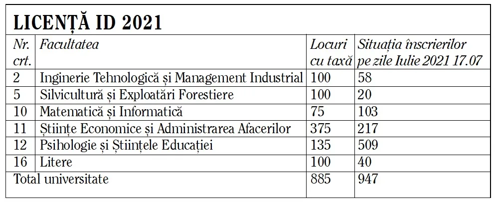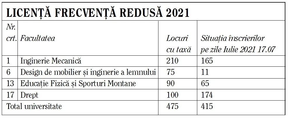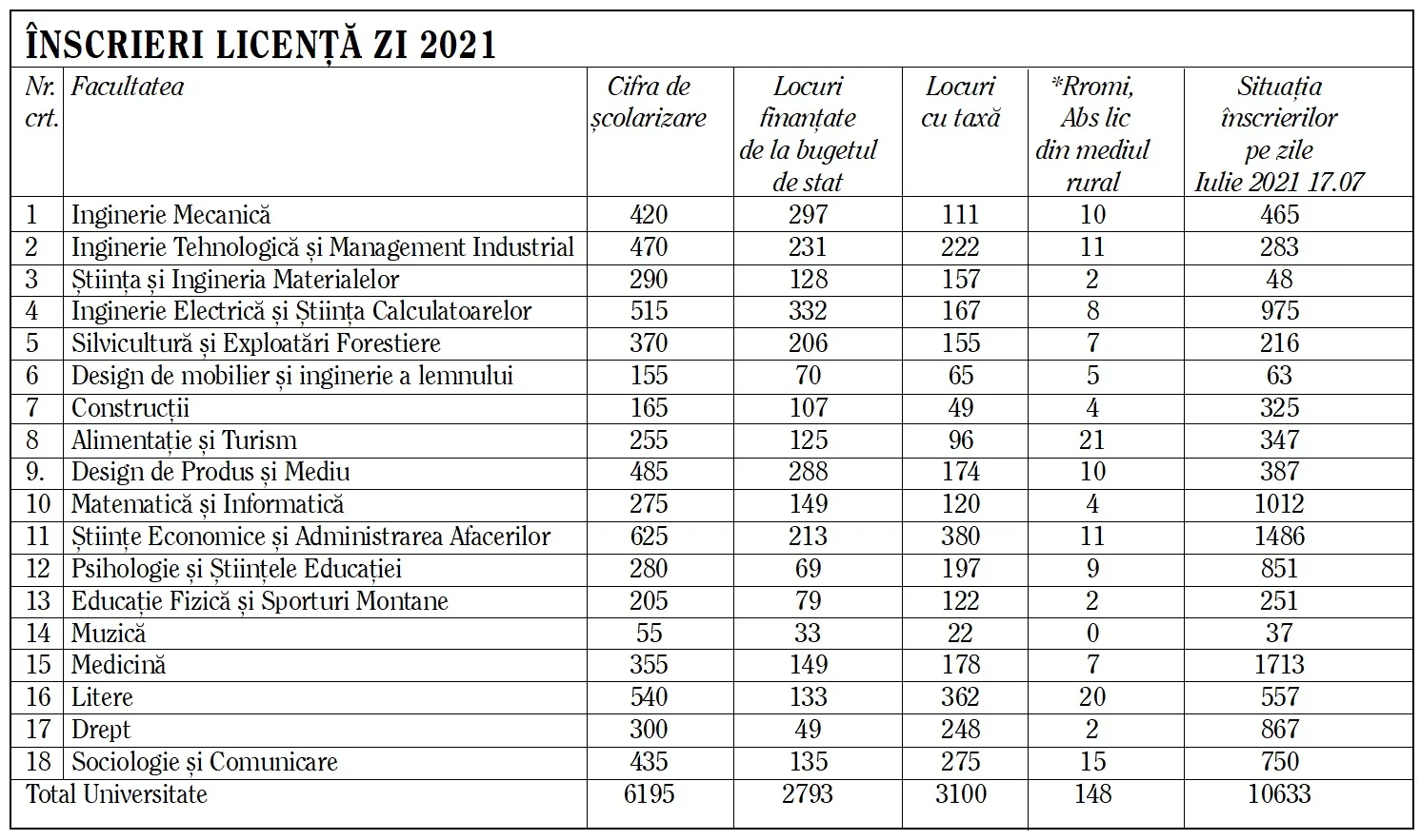 „Universitatea Transilvania Braşov – Situaţie finală înscrieri Admitere 2021”.