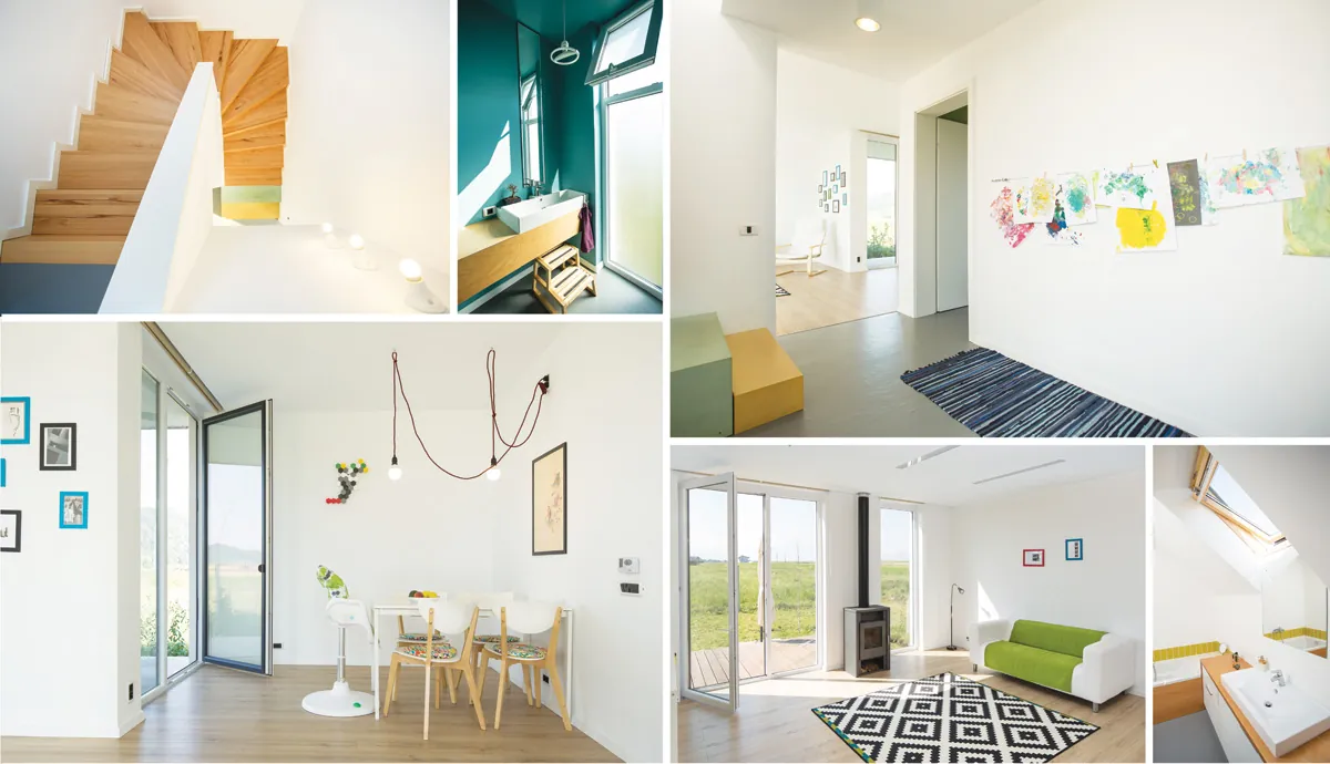 „Pentru o casă mică, 2 terase pot părea o exagerare, însă acestea oferă ambianţe diferite, una deschisă spre perspective largi, însorită, cu iarbă şi copaci, cealaltă umbrită şi mai intimă, protejată pe 2 laturi de pereţii casei, pe celelalte bordată de grădina de legume, cu orizontul mărginit de proximitatea dealului Lempeş, ce are statut de rezervaţie naturală. Spaţiile sunt «împachetate» cât mai compact, pentru a minimaliza suprafeţele exterioare prin care se pierde căldură. Vitrajele sunt orientate cu atenţie, ţinând cont atât de elementele naturale de interes cât şi de aportul energetic al acestora pe timp de iarnă. Pentru umbrirea acestora pe timp de vară am ales să plantăm foioase: cea mai low-tech variantă şi care permite în mod natural aportul solar iarna. S-a avut în vedere, bineînţeles, şi asigurarea unei anvelopante cu pierderi minime de căldură. Pentru a se putea integra ulterior instalaţii de captare a energiei solare casa este dotată cu un versant de acoperiş orientat favorabil”, spun arhitecţii Insert Studio.