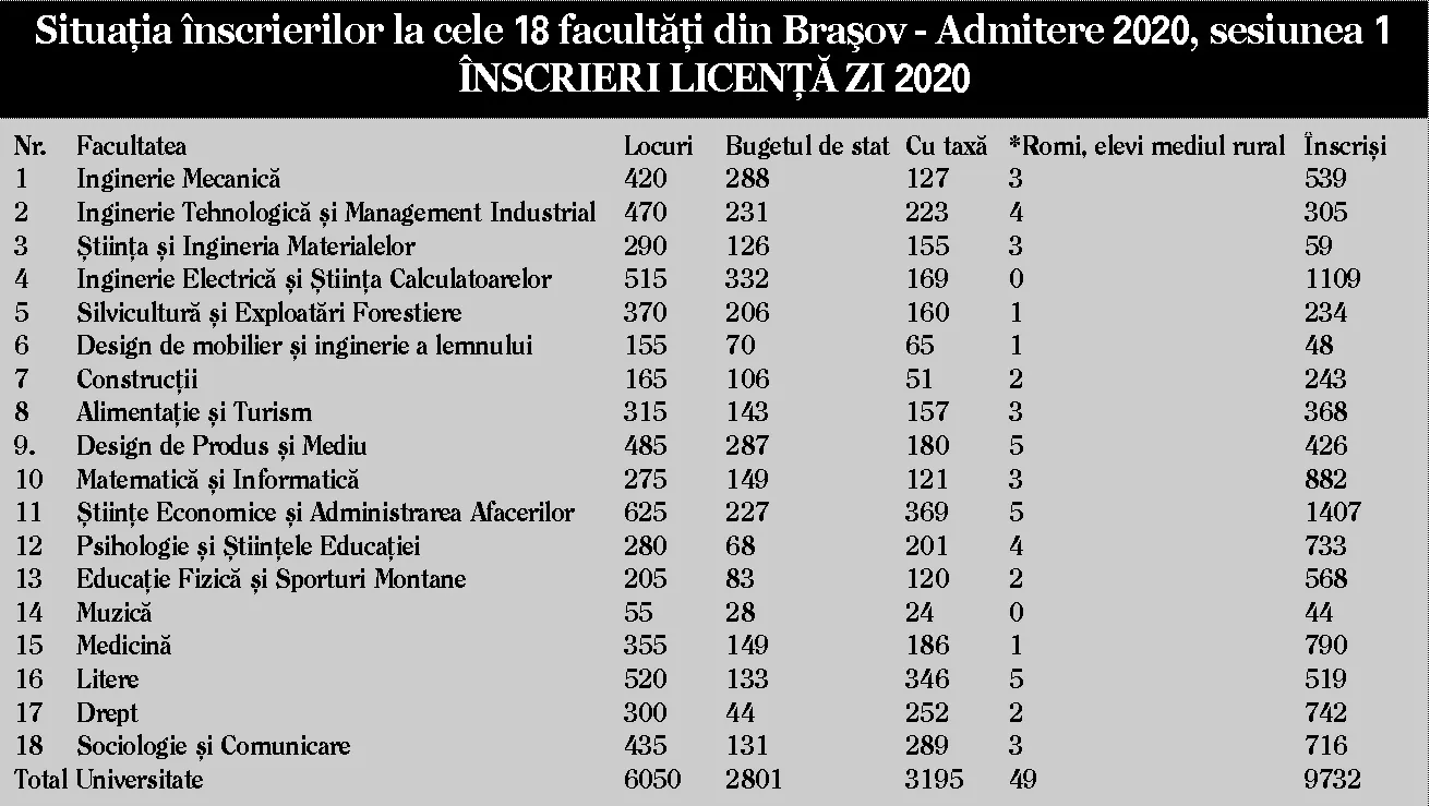 Înscrierile pentru admiterea la facultate, sesiunea de vară 2020 s-au încheiat, la Universitatea „Transilvania”. A fost primul an în care înscrierile au fost 100% on-line, din cauza pandemiei de coronavirus, fapt care a adus mai multe probleme legate de încărcarea documentelor în online. Astfel, înscrierile, stabilite iniţial până în 15 iulie, au fost prelungite până în 18 iulie. La final, Universitatea Transilvania se poate lăuda cu 9.732 de dosare de înscriere. Spunem dosare pentru că un student îşi poate depune dosarul la două sau mai multe facultăţi, în acelaşi timp. Asta cu atât mai mult cu cât examene de admitere nu vor mai avea decât Facultatea de Muzică şi Facultatea de Medicină. Celelalte facultăţi îşi selectează candidaţii pe baza mediei de la Bacalaureat, iar unele iau în calcul şi mediile de la anumite discipline din liceu. Admitere pe dosar.