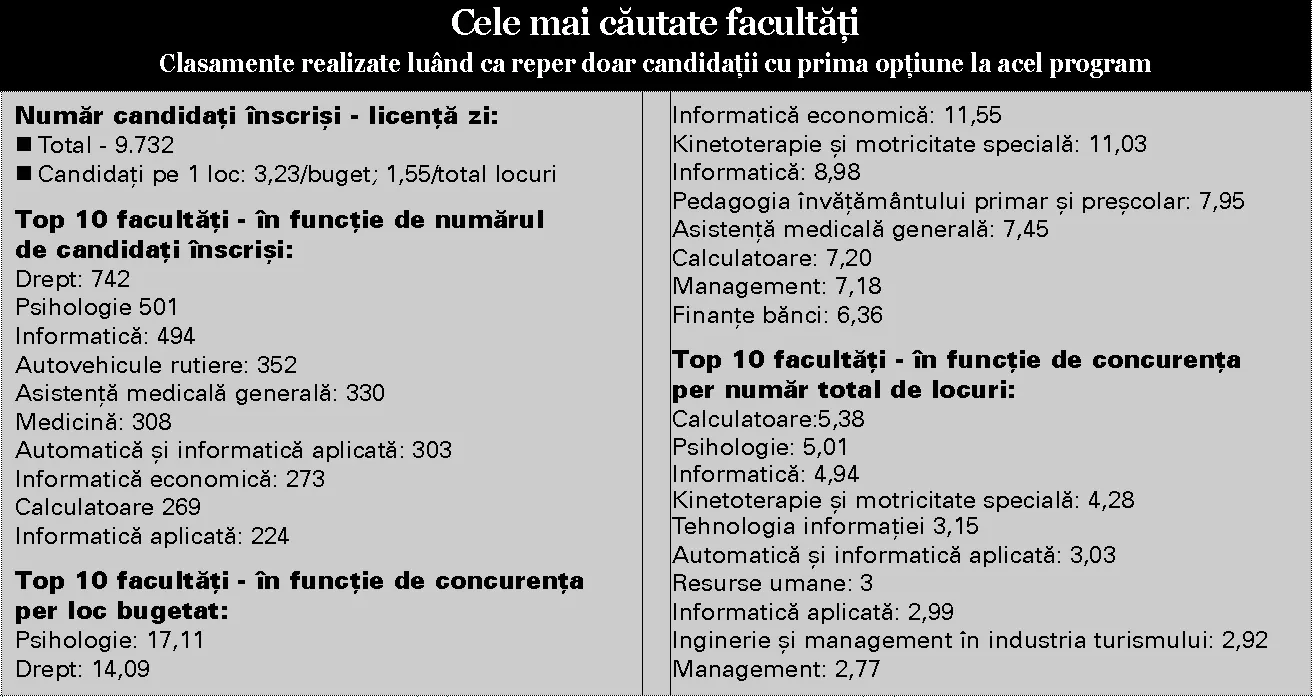 Chiar dacă sunt facultăţi care au mai multe dosare, totuşi, cea mai mare concurenţă se înregistrează la Drept, Psihologie şi Calculatoare, conform datelor oferite de reprezentanţii Universităţii Transilvania.
