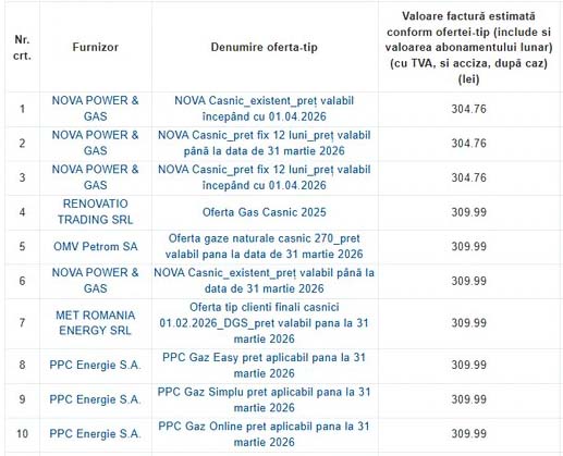 Cel mai mic tarif anunţat aparţine Nova Power & Gas: abonament Nova Casnic_pret fix 12 luni_preţ valabil începând cu 01.04.2026 – 251,87 lei/MWh( cu tot cu tarifele de transport şi distribuţie), costul final, inclusiv valoarea abonamentului lunar, TVA şi accize fiind de 304,76 lei/Mwh.
