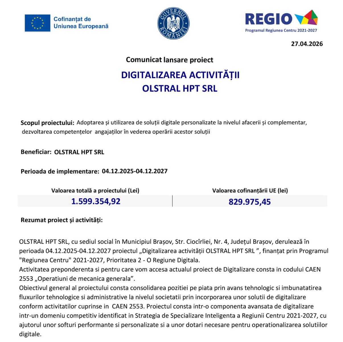 COMUNICAT LANSARE PROIECT: