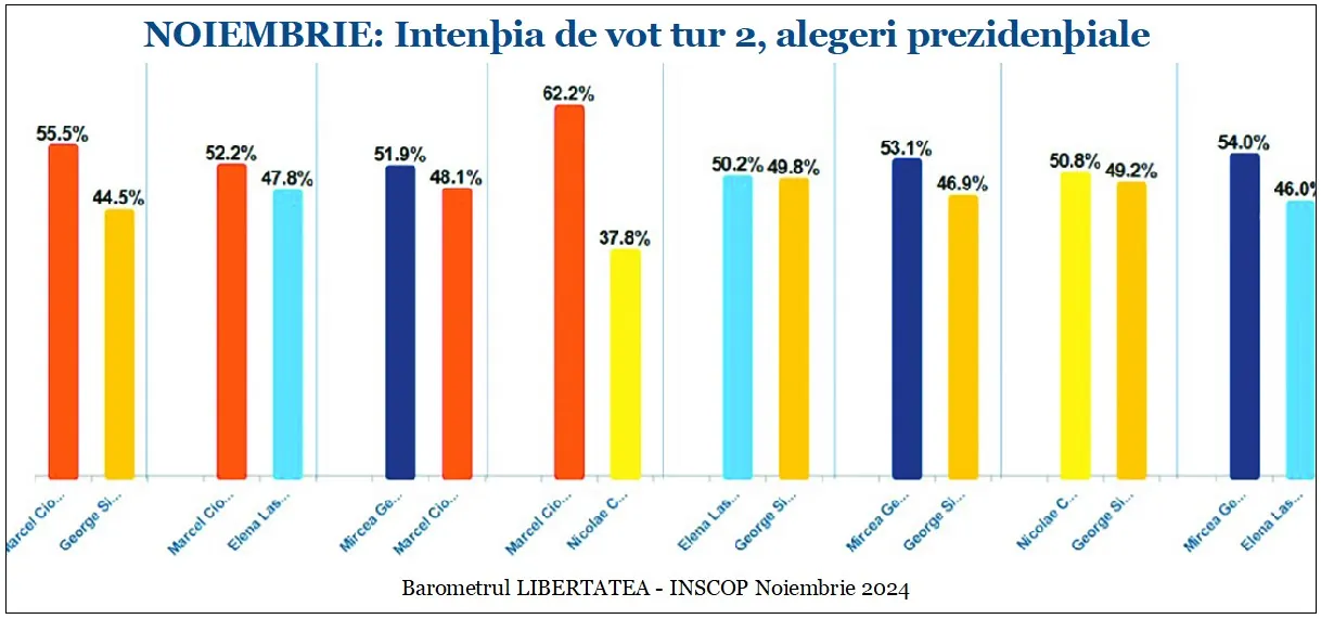 Sondajele au mers şi cu un pas mai departe: „agregarea” pentru turul 2, analiza „pe cupluri”. Astfel, ultimul sondaj Inscop arată că Geoană e singurul care l-ar învinge în pe Ciolacu în turul 2. Acesta este dat ca fiind singurul candidat care ar câştiga în faţa oricărui contracandidat, fie ca se numeşte Marcel Ciolacu, George Simion, Elena Lasconi sau Nicolae Ciucă.