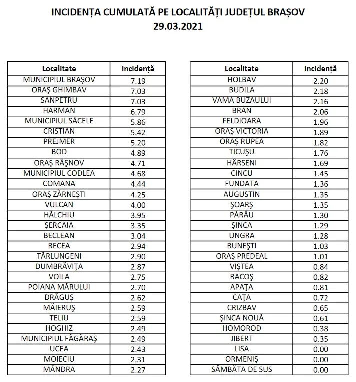 Tendinţa de scădere a început să se manifeste şi în Sânpetru, de la 8,05 cazuri la 1.000 de locuitori în 28 martie, la 7,03 în 29 martie. La fel, incidenţa a scăzut şi în Ghimbav, de la 7,17 cazuri la 1.000 de locuitori în 28 martie, la 7,03 cazuri în 29 martie.