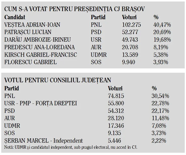 „Rezultatul este bun. Sunt mulţumit de el. PNL este partidul care a câştigat judeţul Braşov. Avem 30 de primării, cea mai importantă fiind cea a municipiului Braşov. De asemenea, am câştigat un nou mandat de preşedinte al Consiliului Judeţean, cu un scor de peste 41%, la o distanţă semnificativă de al doilea clasat. La nivelul Consiliului Judeţean Braşov PNL a obţinut un scor de 30,5%”, a spus Adrian Veştea, care a amintit că se va întoarce la conducerea Consiliului Judeţean Braşov.