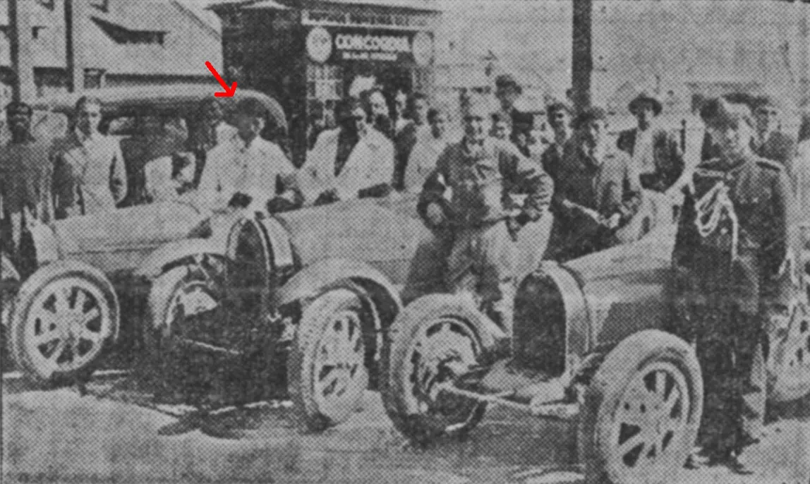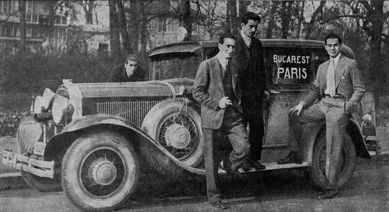 Foto: Calcianu (mijloc) lângã Principele Cantacuziuno (stânga) şi doctorul Dinopol (dreapta) la finalul cursei Bucureşti – Paris, încheiate în 44 de ore şi 11 minute.
