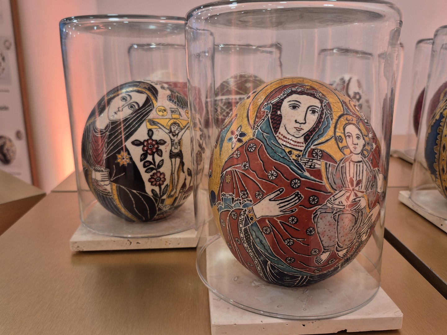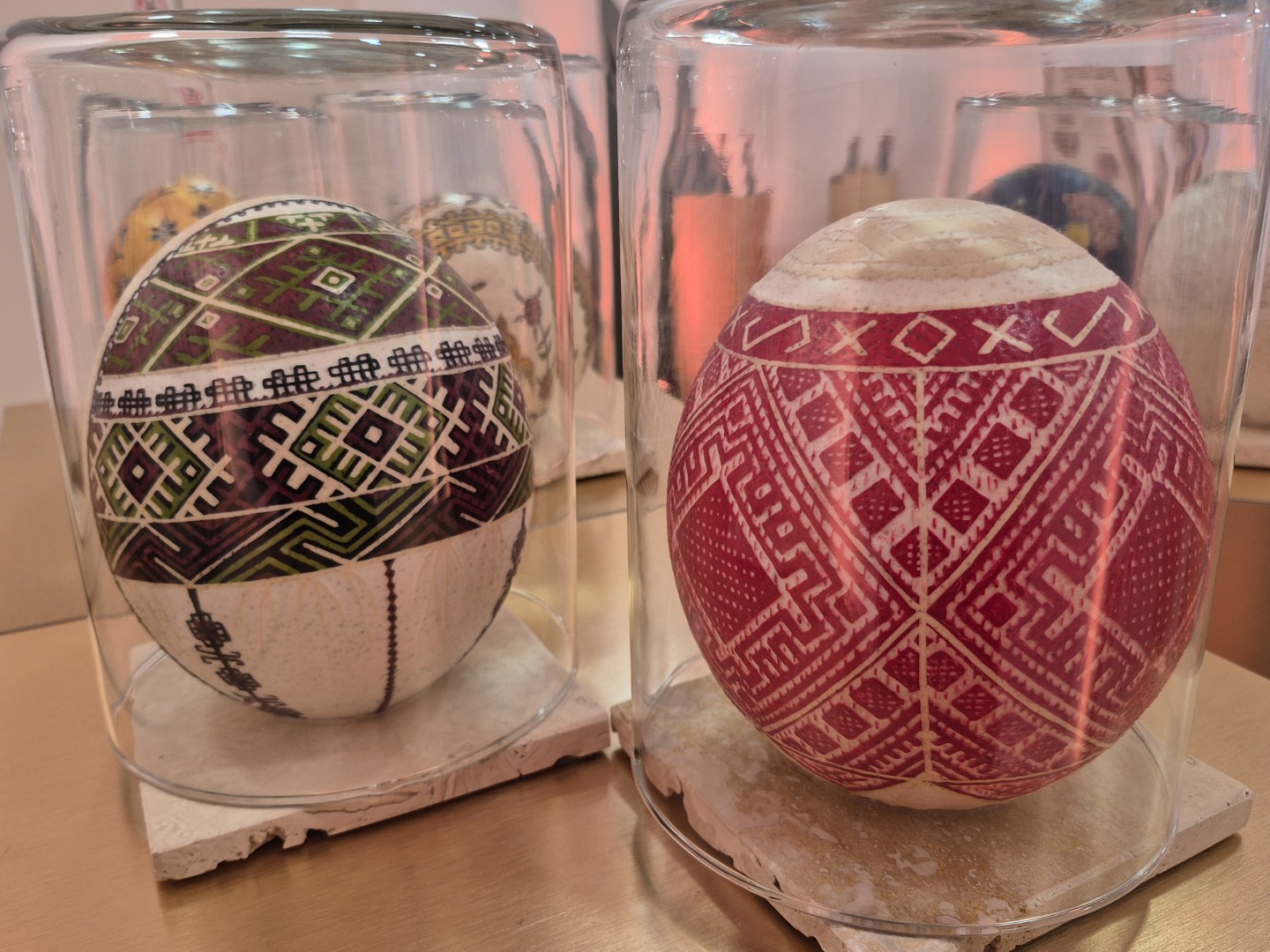 Expoziția prezintă 10 ouă de struț încondeiate cu modele tradiționale inspirate din portul transilvănean și din icoane realizate după izvoade transilvănene din diferite centre de pictură pe sticlă.