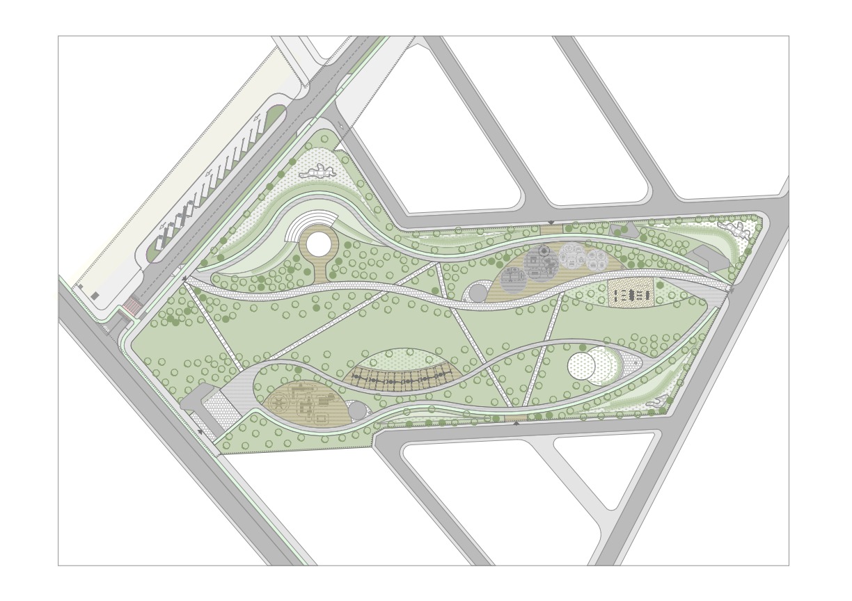 Punctul central al parcului va fi un amfiteatru, cu o scenă în aer liber şi tribună pentru 220 de spectatori. La acestea se adaugă două foişoare de relaxare, o zonă de joacă pentru animale de companie, alei pietonale, cişmele, toalete, locuri de parcare, adăposturi cu suporturi pentru biciclete şi mobilier urban.