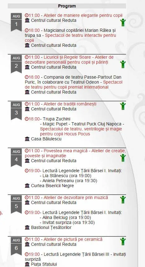 Spectacolele de teatru vor fi susţinute de Magicianul copilăriei – Marian Rîlea, Compania de teatru Passe-Partout Dan Puric, care va prezenta spectacolul „Fluturi şi oameni”, premiat la festivaluri internaţionale de teatru pentru copii, dar şi de Teatrul Puck, care va fi prezent la Braşov cu un spectacol de ventrilogie şi magie. Dimineţile sunt rezervate atelierelor cu temă tradiţională şi de poveste – pictură pe ceramică, potecuţa tradiţiilor (colaj de semne tradiţionale), dezvoltare personală prin poveste şi altele. Participarea la aceste activităţi din Festivalul „A fost odată...”, cu excepţia serilor de lectură, se face contra unei taxe de 10 sau 15 lei. „Astfel de proiecte vin şi în sprijinul candidaturii Braşovului la titlul de Capitală Europeană a Culturii, iar prin acest eveniment se face şi cultură, dar se strâng şi fonduri de care vor beneficia copiii, care vor fi beneficiarii actului de cultură şi vor dezvolta într-un mod normal comunitatea noastră”, a precizat Dragoş David, directorul AMB.
