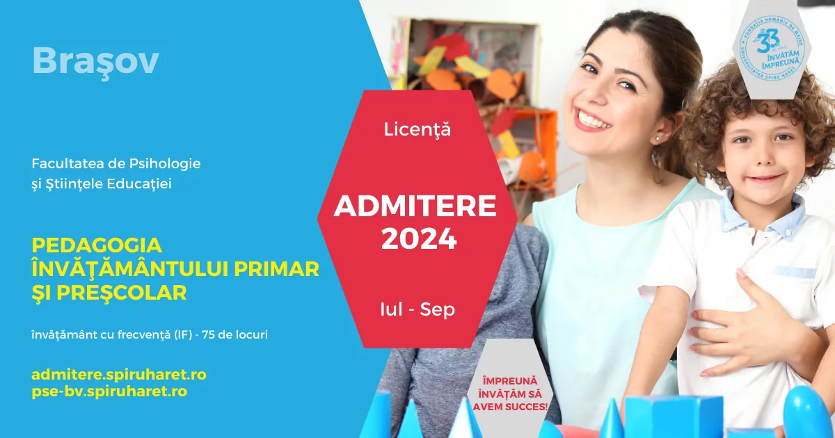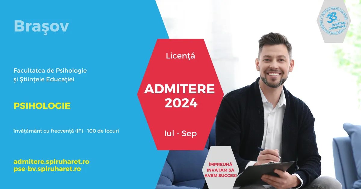 Facultatea de Ştiinţe Juridice şi Ştiinţe Economice (SJEA) şi Facultatea de Psihologie şi Ştiinţele Educaţiei (FPSE) din Braşov din cadrul Universităţii Spiru Haret organizează Admitere pentru anul universitar 2024-2025, la programele de Licenţă şi Masterat!