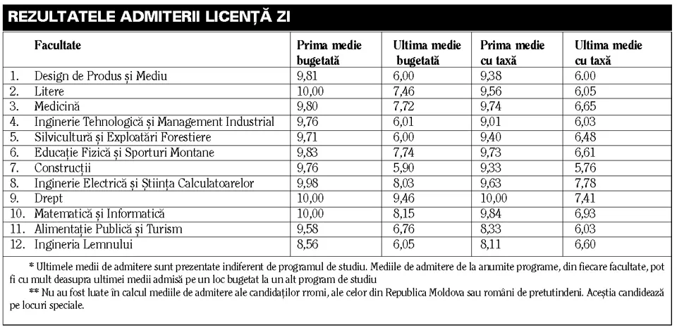 Până acum, pentru programele de licenţă zi, instituţia de învăţământ superior din Braşov deja a „cules” 5 medii de 10,00 la admitere. Astfel, unul a intrat la Facultatea de Litere (programul engleză-franceză), doi la Drept (unul la buget şi unul la taxă – care a ales de la bun început programul la „cu taxă”) şi alţi doi la Matematică şi Informatică (unul la Informatică aplicată şi celălalt la Informatică aplicată în limba germană). De altfel, la Facultatea de Matematică şi Informatică, pentru programul de Informatică aplicată, concurenţa a fost una serioasă, iar ultima medie bugetată cu care s-a intrat a fost 9,66. Locurile „cu taxă” la acelaşi program au fost ocupate cu medii între 9,65 şi 9.40. Şi la programul de Matematică şi Informatică, mediile sub 9 nu aveau nicio şansă. Ultima medie bugetată admisă aici a fost 9,49, iar la „cu taxă”, ultima medie admisă a fost 9,23. Medii uşor mai mici au fost la Informatică aplicată în limba germană, unde la „cu taxă”, au fost admise şi medii sub 8,00.