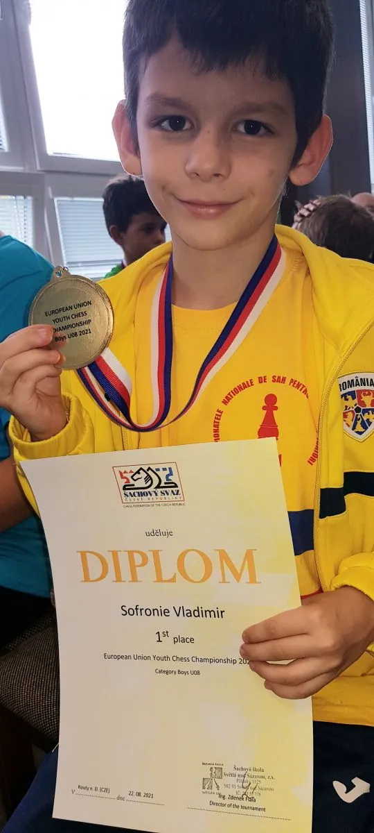 Vladimir Sofronie, un băieţel din Braşov în vârstă de 8 ani, a câştigat detaşat medalia de aur la Campionatul European de Şah Clasic U8 (participanţii au mai puţin de opt ani – n.red.), neînvins, cu 8,5 puncte din 9 posibile – deşi a fost prima lui participare la un concurs în afara ţării – la distanţă uriaşă faţă de următorii clasaţi (la 2,5 puncte faţă de următorul clasat). Vladimir era deja campion detaşat înainte de ultima rundă!