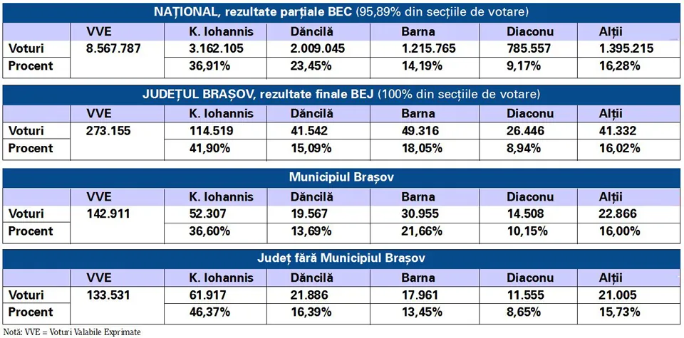 Alegerile prezidenţiale desfăşurate în weekend au avut una din cele mai bune prezenţe din ţară la Braşov. Cu un procent de 53,76 % dintre alegătorii de pe liste prezentaţi la urne, judeţul nostru s-a situat pe podium, la egalitate cu vecinii din Sibiu, după judeţele Ilfov şi Cluj. „Din totalul de 516.560 de alegători s-au prezentat la vot 277.724, ceea ce înseamnă o prezenţă de 53,76%. Dintre aceştia, avem 273.155 de voturi valabil exprimate”, a precizat purtătorul de cuvânt al Biroului Electoral Judeţean, Claudiu Petra. Câştigător în judeţul Braşov a fost actualul preşedinte, însă ordinea celorlalţi doi candidaţi de pe podium a fost alta faţă de cea de pe ţară. „Pentru candidatul Klaus Werner Iohannis s-au exprimat 114.519 voturi, care reprezintă 41,92%. Pentru Ilie Dan Barna au fost exprimate 49.316 voturi, ceea ce reprezintă 18,05%”, a mai arătat Claudiu Petra. Pe locul al treilea s-a clasat Viorica Vasilica Dăncilă, cu un procentaj de 15,21%. Pe locul al patrulea s-a clasat Mircea Diaconu, cu 9,68% din voturi, urmat de Theodor Paleologu, cu 5,38%. Ultimul care a trecut pragul pentru finanţarea cheltuielilor electorale a fost Kelemen Hunor, cu 3,31% din voturile braşovenilor. Ceilalţi candidaţi nu au reuşit să treacă de pragul de 3%. După cum a mai precizat Claudiu Petra, scrutinul s-a desfăşurat în judeţul nostru fără incidente majore. Potrivit lui Petra, au fost necesare doar câteva lămuriri suplimentare în cazul preşedinţilor de secţii, al vicepreşedinţilor sau al operatorilor pe tablete care nu au înţeles unele lucruri la momentul instructajului.